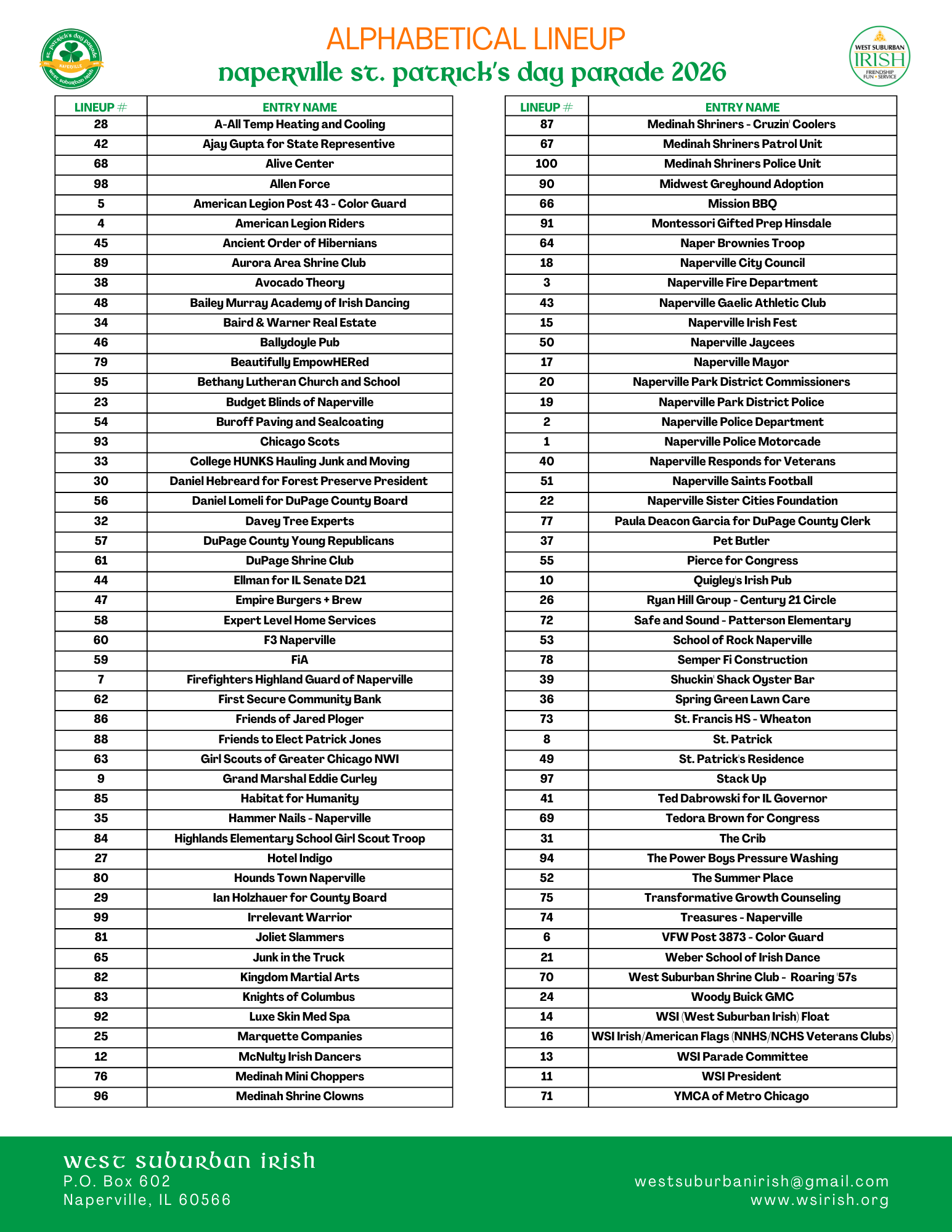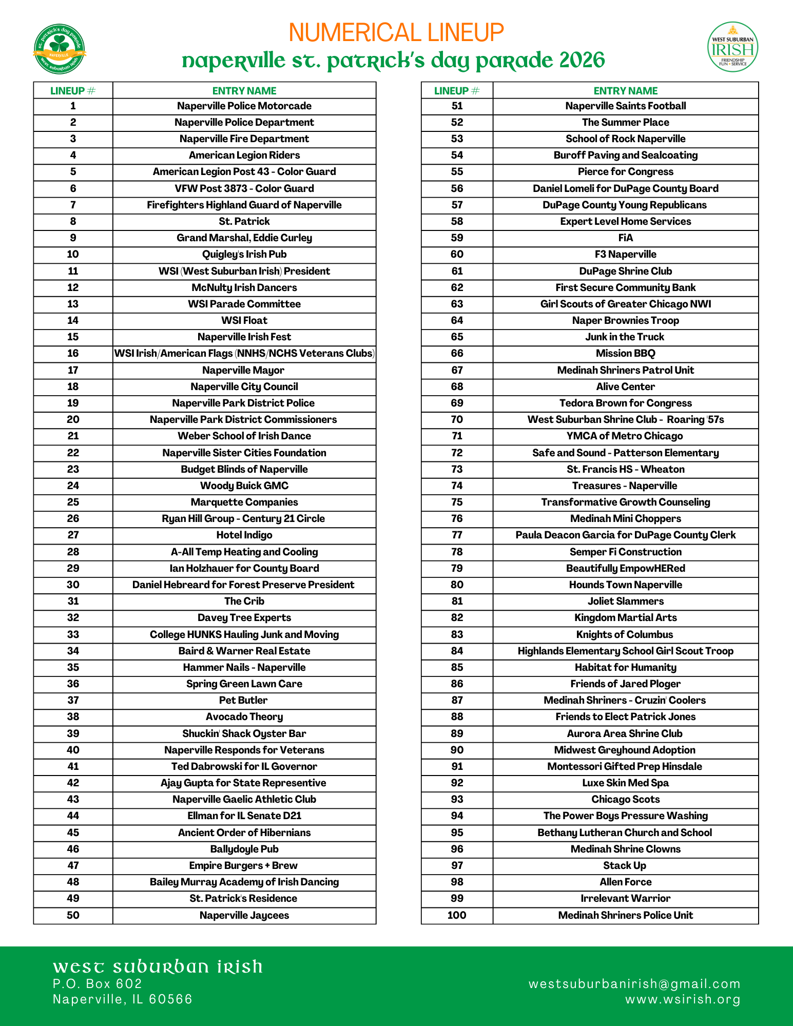 Always allow extra time on parade morning, as there will obviously be a lot of traffic converging upon the staging area at once. Parking at Naperville North High School (NNHS) is more limited this year due to construction. Walking participants must be dropped off on the north side of NNHS. Temporary parking is available along with street parking in the vicinity of the staging area. After the parade, parking is available on Hillside Road near Naperville Central High School (NCHS) for marcher pick-up.